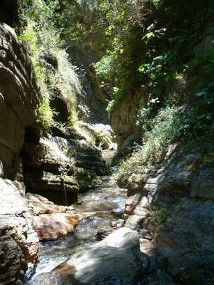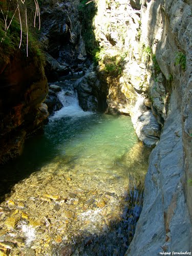 Seguidamente llegaremos a un puente colgante y lo atravesamos dándonos acceso a las ruinas de la Fabriquilla de la luz de Picena. Un edificio en el que se aprovechaba una traída de agua con un gran desnivel para producir energía eléctrica. Construida en los años 40 del siglo XX, dejó de funcionar en los años 60. Abastecía a distintos pueblos del entorno estando limitada la demanda permitida a una bombilla por vivienda, debido a la baja cantidad de energía que se podía producir. Al lado de este edificio, se accede al río y un poco más arriba a las mejores pozas para darse un refrescante baño en un entorno espectacular con un estrecho cañón excavado sobre roca por las aguas del río.
